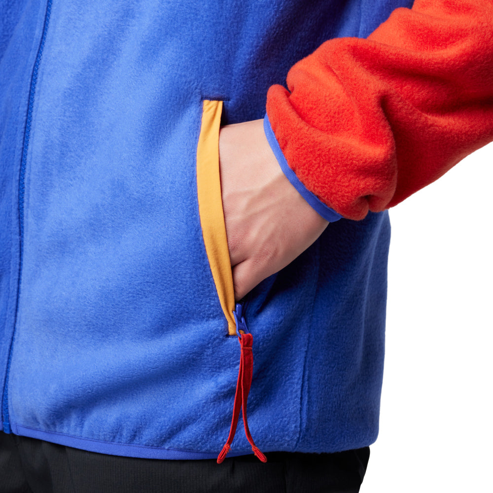Das Design in Rot und Blau, kombiniert mit orangenen Akzenten, verleiht der Jacke einen unverwechselbaren Retro-Look. Praktische Features wie die elastischen Bündchen an Ärmeln und Saum sowie der eingefasste Kragen sorgen für einen perfekten Sitz. Seitliche Reißverschlusstaschen bieten sicheren Stauraum für deine Essentials, damit du alles Wichtige immer griffbereit hast.